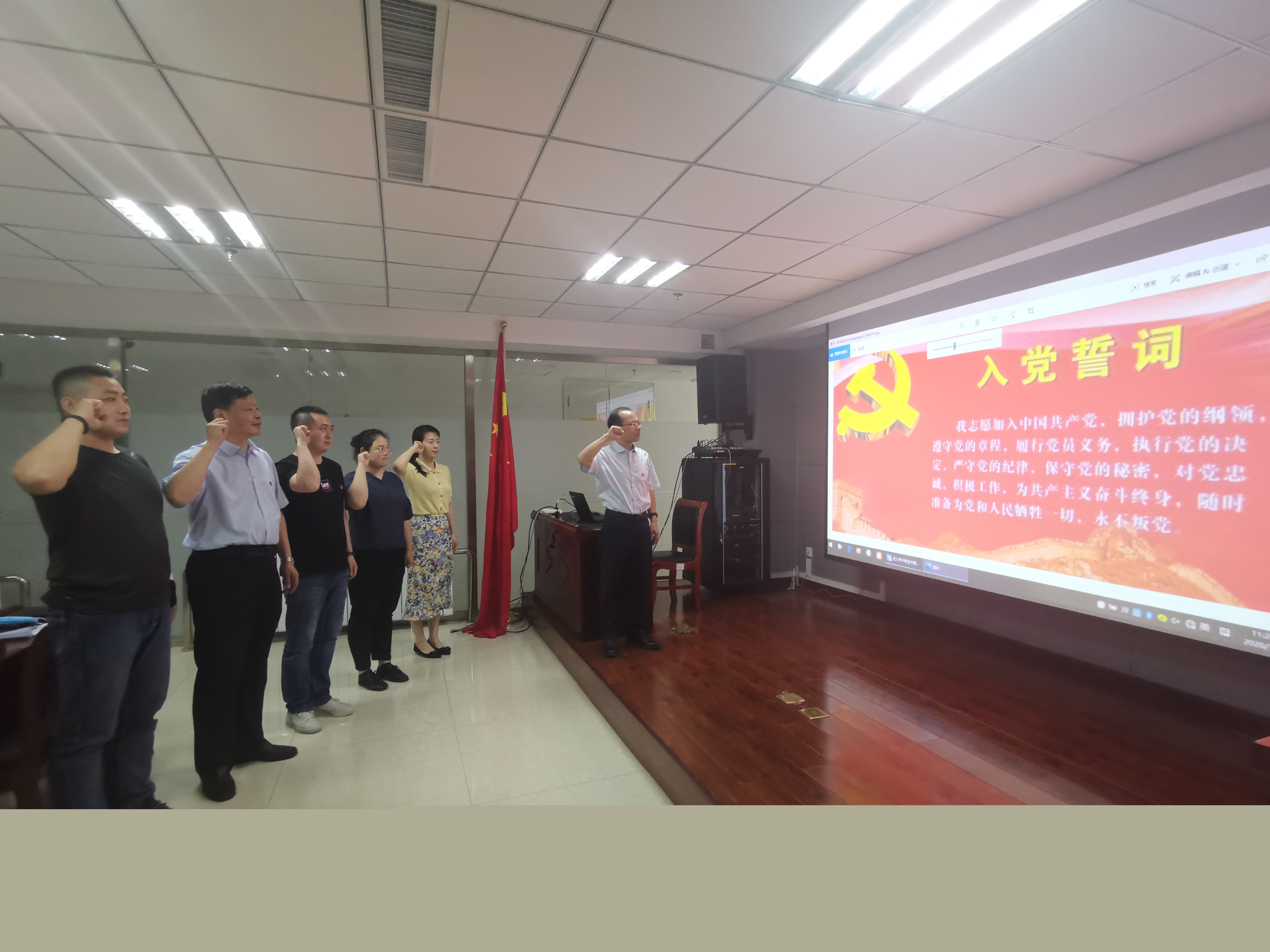 由黨支部書記焦俊良同志領(lǐng)誓,全體黨員面對鮮紅的黨旗,舉起右拳,莊嚴(yán)宣誓?!拔倚模何抑驹讣尤胫袊伯a(chǎn)黨,擁護黨的綱領(lǐng),遵守黨的章程,履行黨員義務(wù),執(zhí)行黨的決定,嚴(yán)守黨的紀(jì)律,保守黨的秘密,對黨忠誠,積極工作,為共產(chǎn)主義奮斗終身,隨時準(zhǔn)備為黨和人民犧牲一切,永不叛黨。”鏗鏘有力的誓言,讓每名黨員受到了一次深刻的黨性教育和政治靈魂洗禮。