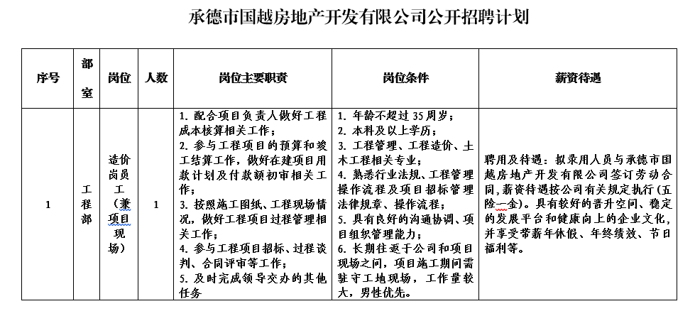 本次擬招聘1個(gè)崗位共計(jì)1人。具體應(yīng)聘條件見附件《承德市國(guó)越房地產(chǎn)開發(fā)有限公司公開招聘計(jì)劃表》 。